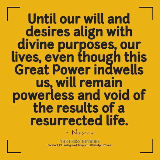 Take note that, until our will and desires align with divine purposes, our lives, even though this Great Power indwells us, will remain powerless and void of the results of a resurrected life.